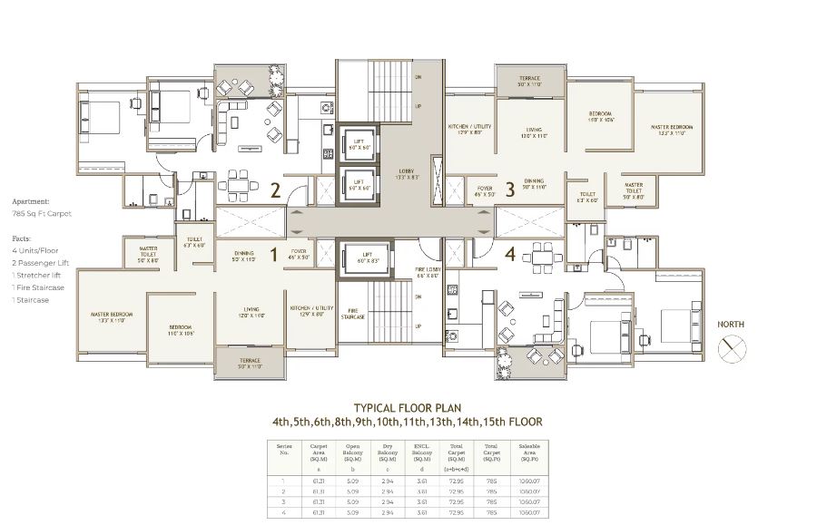 - Area For 2 Bhk 785 Sqft: Price 74 Lac